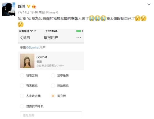 有网友看到舒淇举报“假舒淇”,还在底下留言说:“妞,你智商上去了阿!”、“淇哥厉害”、“哈哈!史上最萌的举报”、“我只能说,你偶尔还是挺聪明的”。
